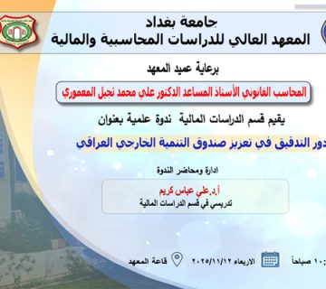 اعلان عن ندوة علمية يقيمها قسم الدراسات المالية في المعهد بعنوان (دور التدقيق في تعزيز صندوق التنمية الخارجي العراقي)