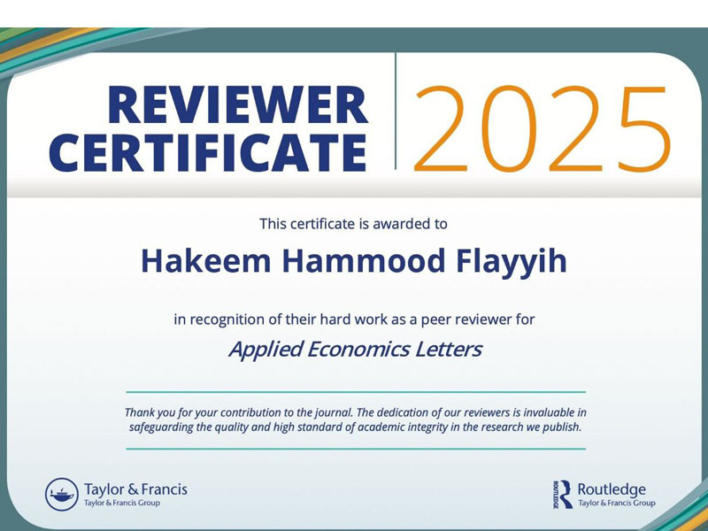 وتعد المجلة Applied Economics Letters والتي ضمن الربع الثاني(Q2) في مستوعب Scopus بمعامل استشهاد (3.2)، وضمن الربع الثالث (Q3) في مستوعب Web of Science وبمعامل تأثير (1.2)، واحدة من المجلات الرائدة في مجال الدراسات في التخصصات المحاسبية والاقتصادية مما يعكس أهمية التقييم العلمي الذي قدّمه الأستاذ المساعد الدكتور حكيم حمود فليح، ودوره الفاعل في دعم البحث الأكاديمي وتعزيز جودة الدراسات المنشورة في المجلات المحكمة.