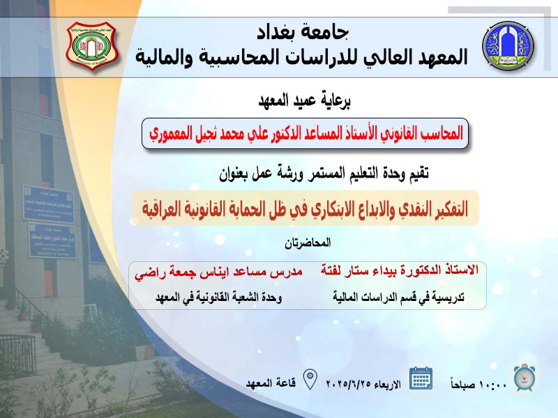 يوم الاربعاء 2025/6/25 الساعة العاشرة صباحاً وستقام الورشة حضورياً على قاعة المعهد