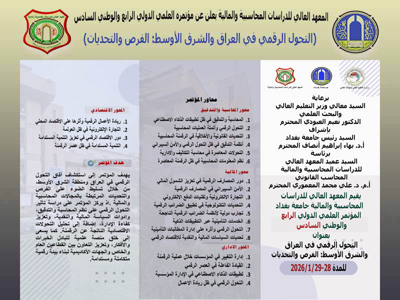 المعهد العالي للدراسات المحاسبية والمالية في جامعة بغداد يعلن عن مؤتمره العلمي الدولي الرابع والوطني السادس بعنوان (التحول الرقمي في العراق والشرق الأوسط: الفرص والتحديات) والذي سيعقد في المدة 28-29 كانون الثاني 2026.