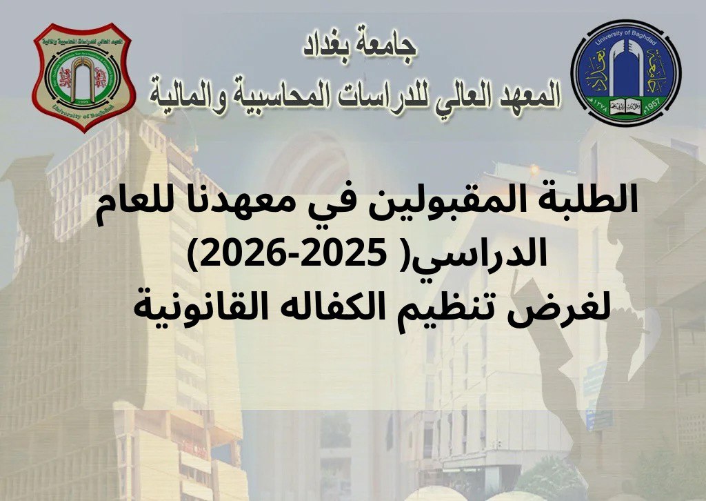 الطلبة المقبولين في معهدنا للعام الدراسي (2025-2026) لغرض تنظيم الكفاله القانونية تنسب حضوركم الى الشعبة القانونية يوم الاثنين المصادف 2025/9/1 مع (الكفيل) مستصحبين معكم المستمسكات التالي:
