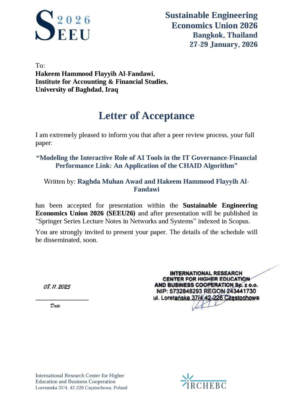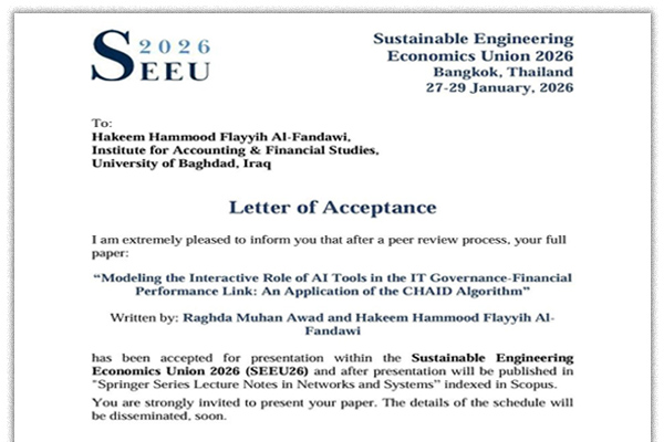 للنشر في مؤتمر الاتحاد الدولي للهندسة والاقتصاد المستدام (SEEU 2026) الذي سيُعقد في بانكوك – تايلند للمدة من 27 إلى 29 كانون الثاني 2026. وسيتم نشر البحوث المقبولة بعد العرض في سلسلة Lecture Notes in Networks and Systems الصادرة عن دار النشر العالمية Springer والمفهرسة ضمن قاعدة البيانات Scopus.